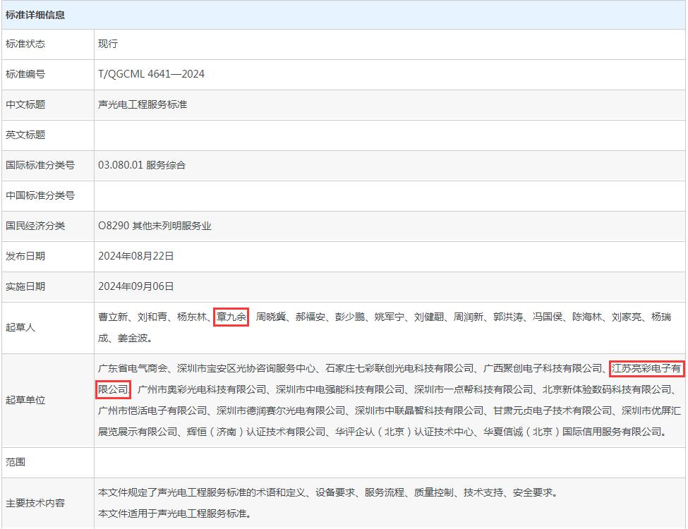 由LED工程商聯盟首次主導、全國城市工業品貿易中心聯合會發布的T/QGCML 4641—2024《聲光電工程服務標準》團體標準正式發布。江蘇亮彩憑借深厚的行業經驗沉淀,參與到團體標準的建設中,成為參編單位之一。